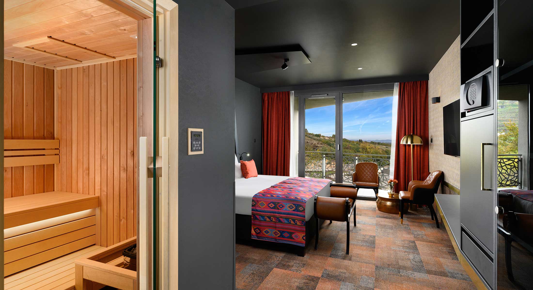 Ciesz się urzekającym widokiem na wzgórza krainy winnic z komfortowych balkonów pokojów Deluxe!